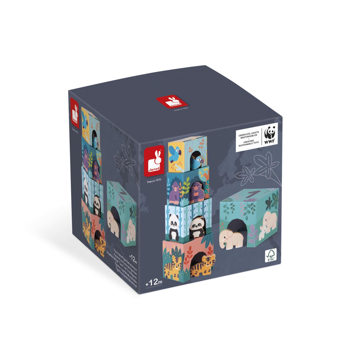 Esta torre de empilhar em cartão da Janod, ideal para bebés a partir dos 12 meses, oferece múltiplas formas de brincar e aprender.
