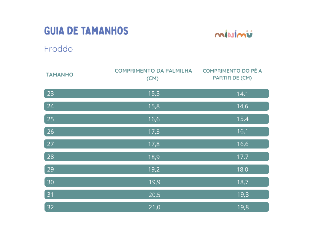 A numeração de outras marcas pode não corresponder à dos modelos Froddo. Use sempre o guia de tamanhos de forma a escolher o número certo. Por vezes, a forma varia de modelo para modelo dentro da mesma marca, por isso recomendamos consultar sempre o guia disponível na página de cada produto.