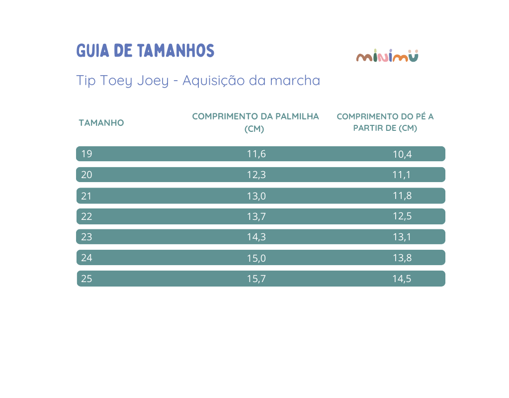A numeração de outras marcas pode não corresponder à dos modelos Tip Toey Joey. Use sempre o guia de tamanhos de forma a escolher o número certo. Por vezes, a forma varia de modelo para modelo dentro da mesma marca, por isso recomendamos consultar sempre o guia disponível na página de cada produto.
