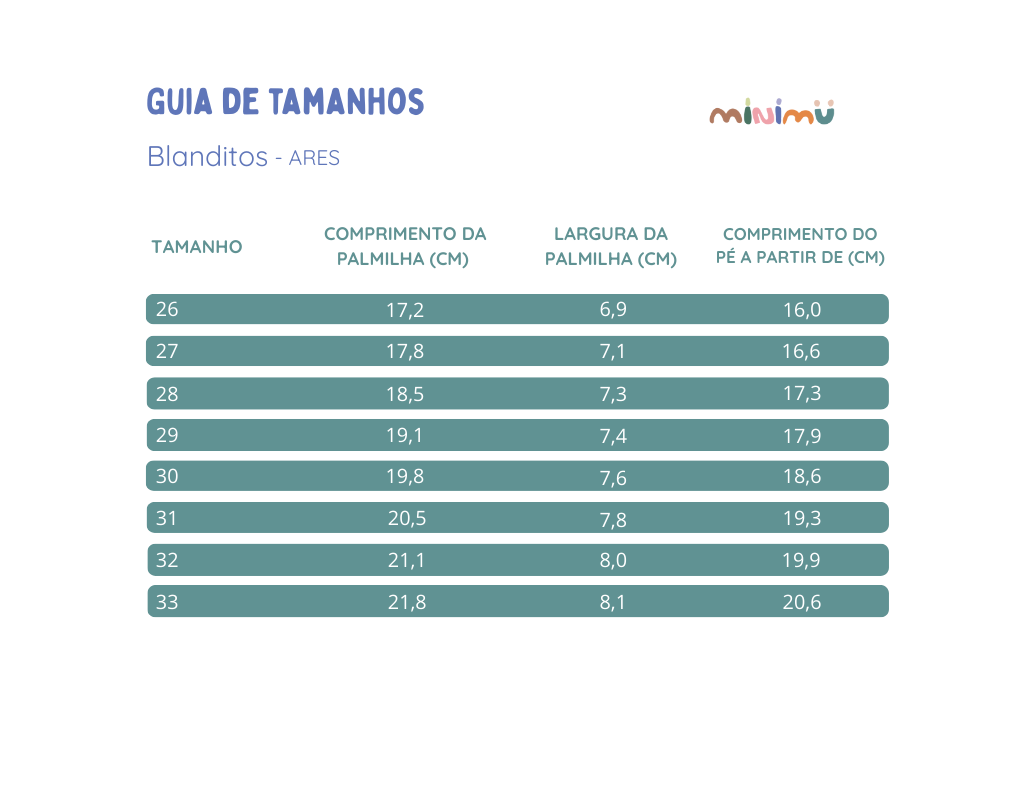 A numeração de outras marcas pode não corresponder à dos modelos Blanditos. Use sempre o guia de tamanhos de forma a escolher o número certo. Por vezes, a forma varia de modelo para modelo dentro da mesma marca, por isso recomendamos consultar sempre o guia disponível na página de cada produto.