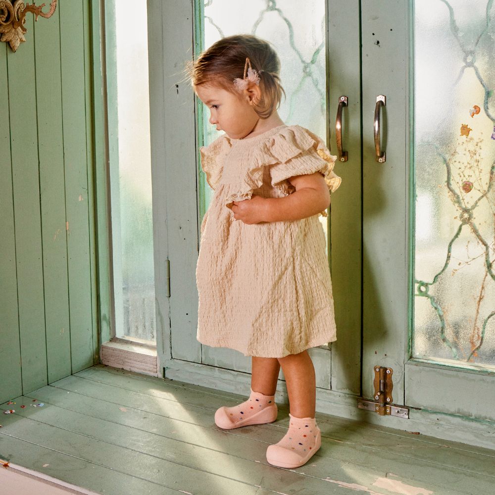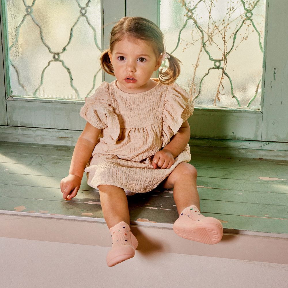 A sola, com apenas 2 mm, é respirável, muito leve e flexível, permitindo que a criança sinta tudo o que pisa. Modelo com meia de cano baixo.