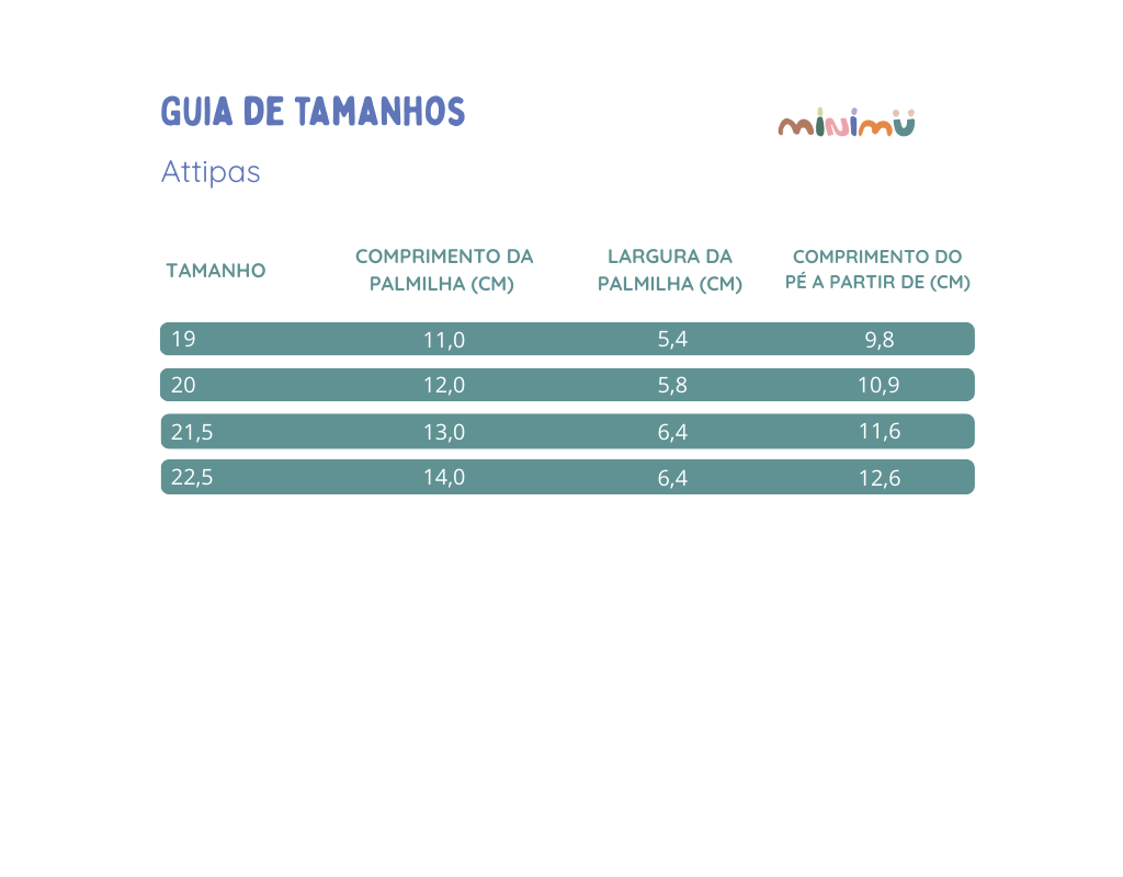 A numeração de outras marcas pode não corresponder à dos modelos Attipas. Use sempre o guia de tamanhos (ver imagem abaixo) de forma a escolher o número certo.