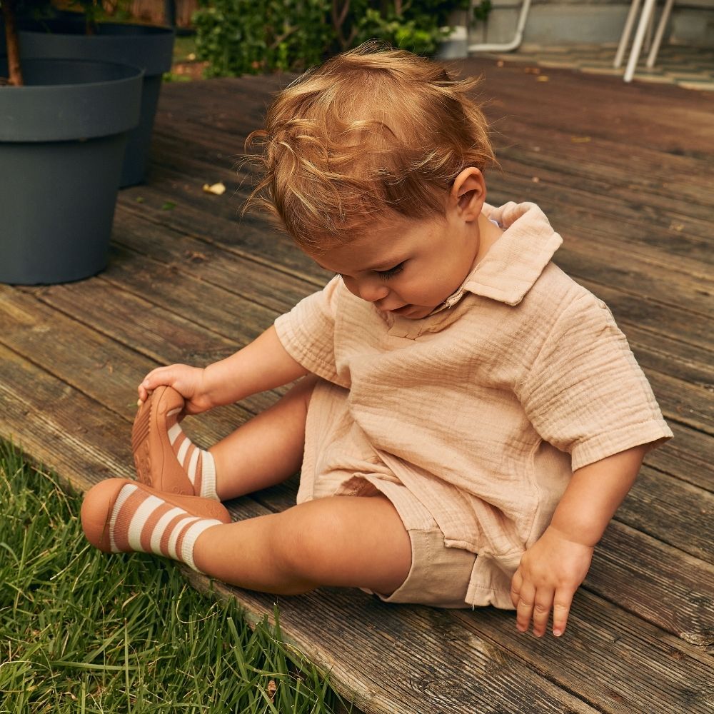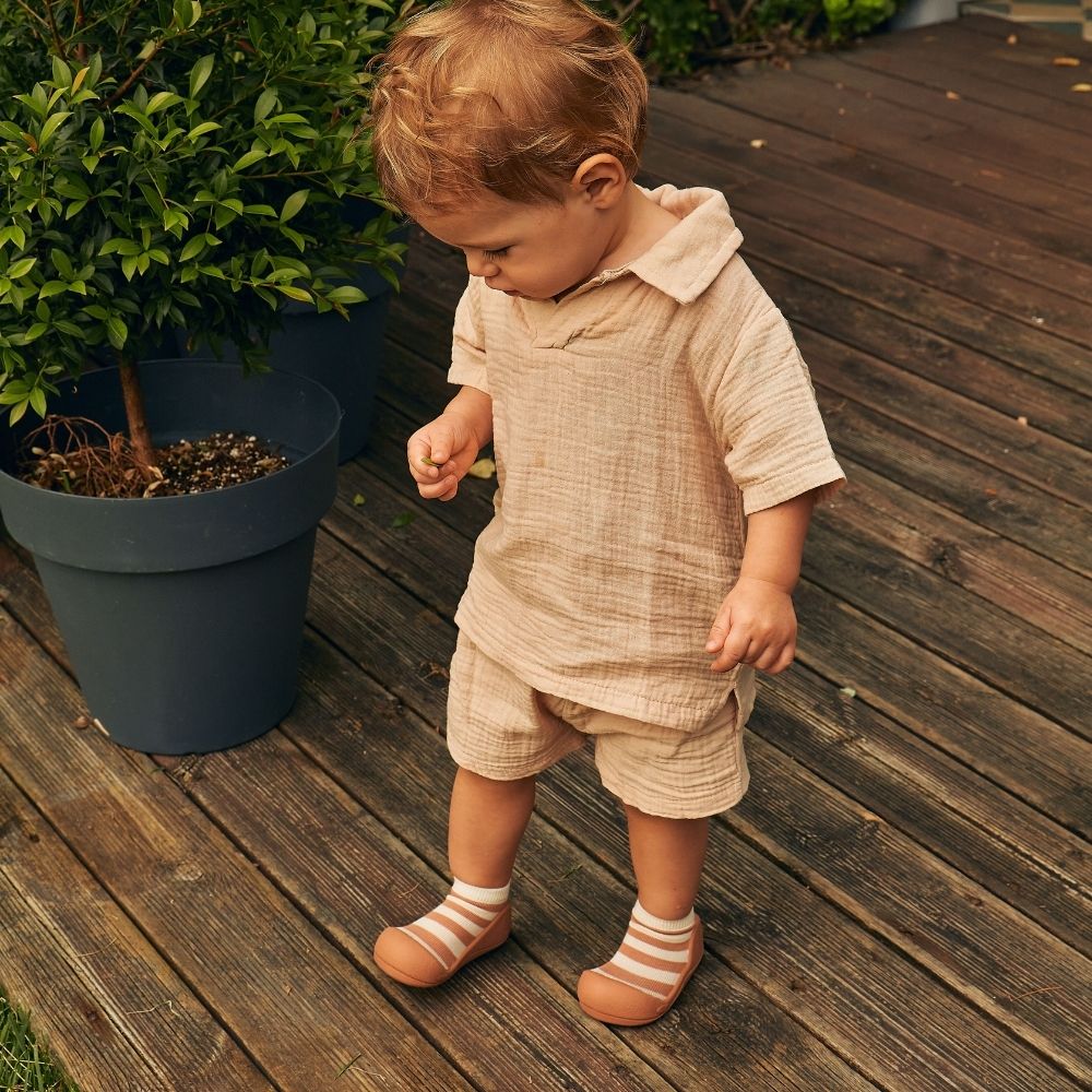 A sola, com apenas 2 mm, é respirável, muito leve e flexível, permitindo que a criança sinta tudo o que pisa. Modelo com meia de cano baixo.