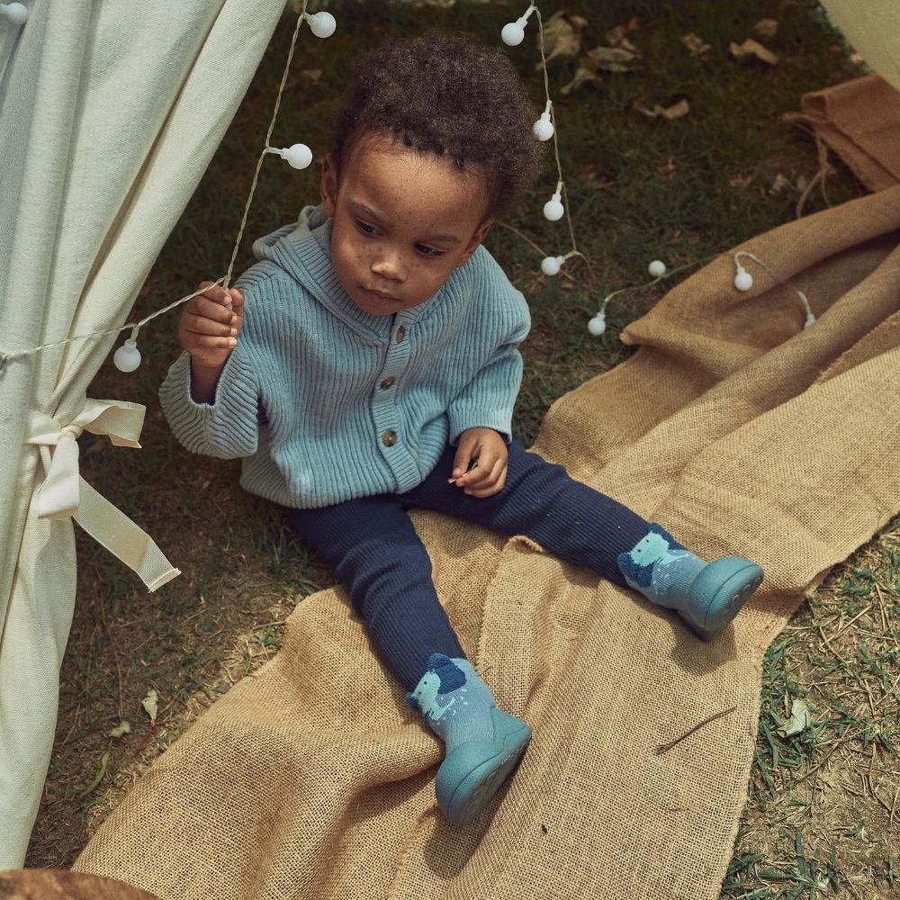 O modelo Zootopia Elephant Blue é confecionado em algodão com certificação Oeko-Tex Standard, com meia de cano médio/alto — ideal para aquecer os tornozelos nos meses mais frescos. Perfeitas tanto para uso interior como exterior.