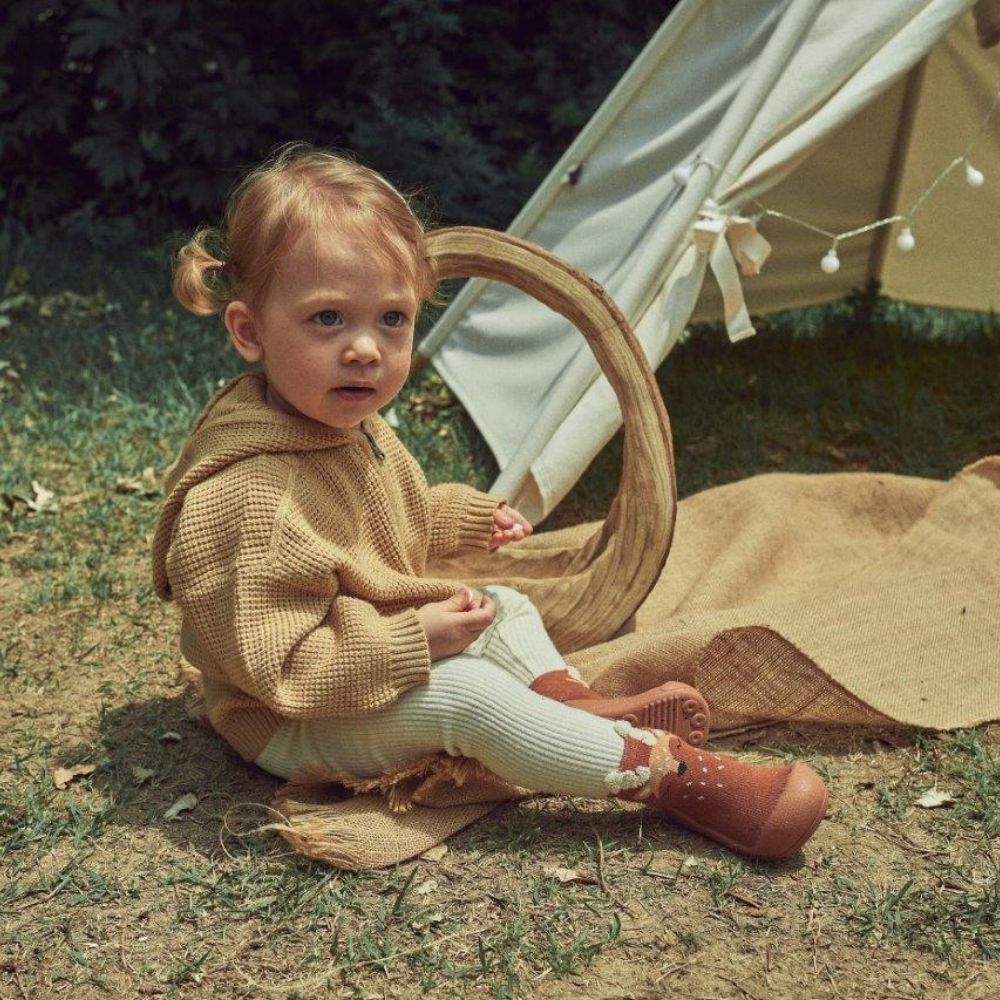 A sola, com apenas 2 mm, é respirável, muito leve e flexível, permitindo que a criança sinta tudo o que pisa.