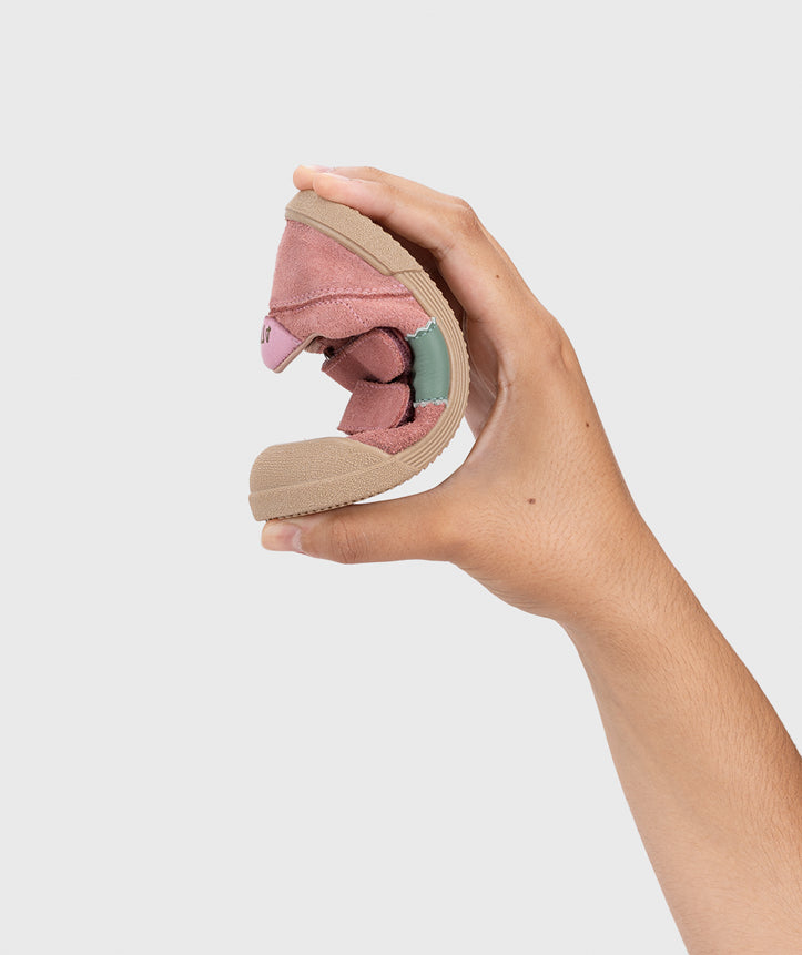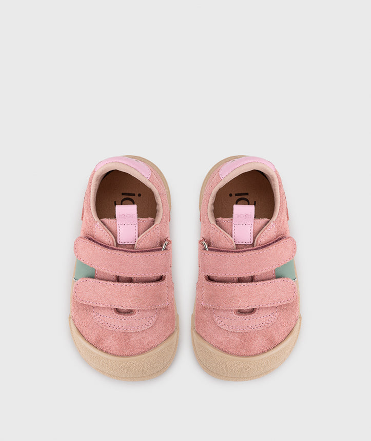 Estas sapatilhas em camurça foram desenhadas segundo o conceito barefoot wide, com biqueira mais ampla e sola totalmente plana e flexível.