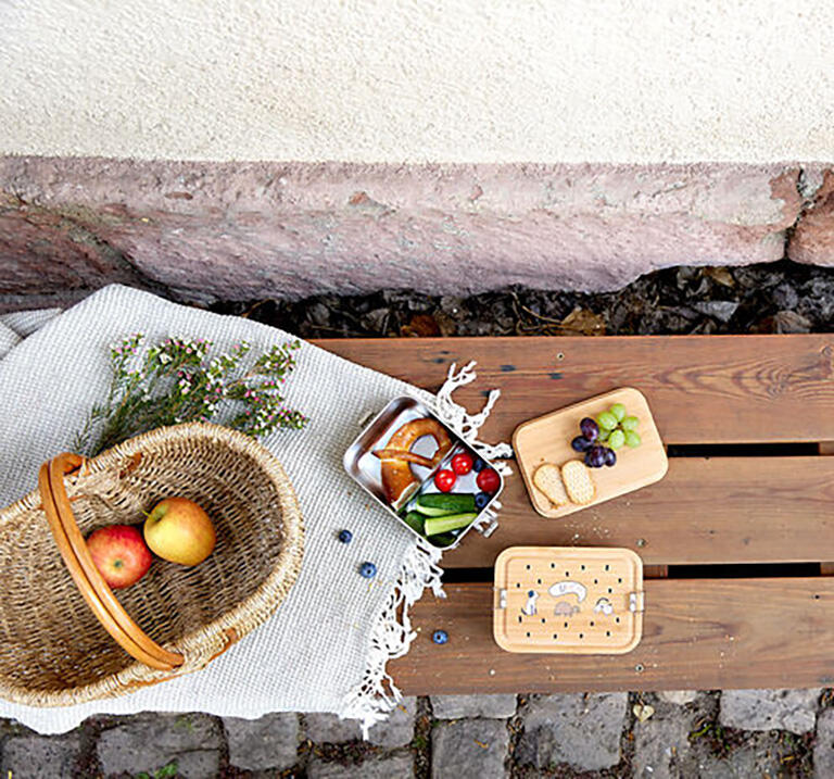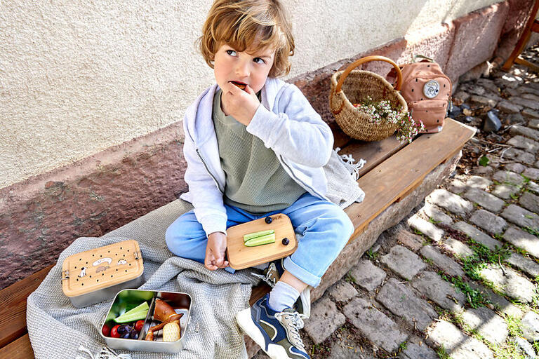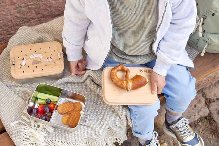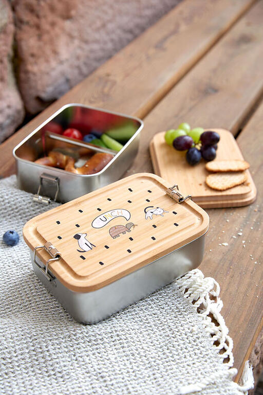 A lancheira LÄSSIG em aço inoxidável com tampa de bambu é uma opção prática e durável para levar o lanche para a escola, passeios ou viagens.
