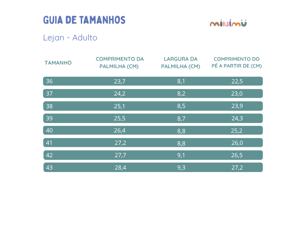 A numeração de outras marcas pode não corresponder à dos modelos Lejan. Use sempre o guia de tamanhos de forma a escolher o número certo. Por vezes, a forma varia de modelo para modelo dentro da mesma marca, por isso recomendamos consultar sempre o guia disponível na página de cada produto.