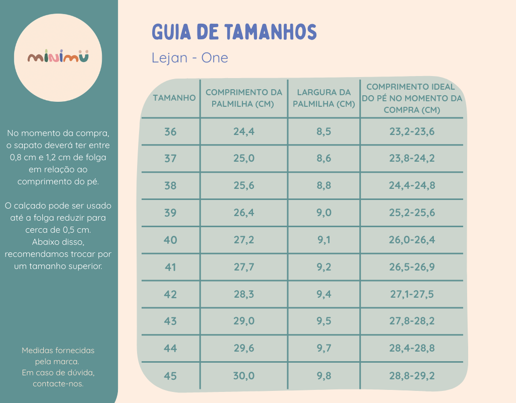 A numeração de outras marcas pode não corresponder à dos modelos Lejan. Use sempre o guia de tamanhos (ver imagem abaixo) de forma a escolher o número certo. Por vezes, a forma varia de modelo para modelo dentro da mesma marca, por isso recomendamos consultar sempre o guia disponível na página de cada produto.